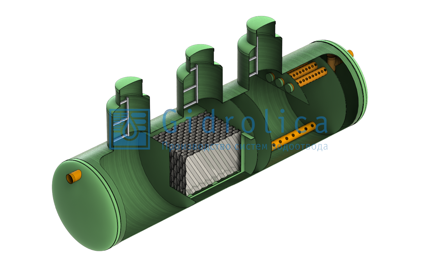 Gidrolica LOS-System 3 отличается высокой производительностью. Это оборудование можно включать в состав систем, испытывающие постоянные и большие нагрузки. В конструкции Gidrolica LOS-System предусмотрены 3 колодца, обеспечивающие доступ к отдельным элементам очистительных устройств.